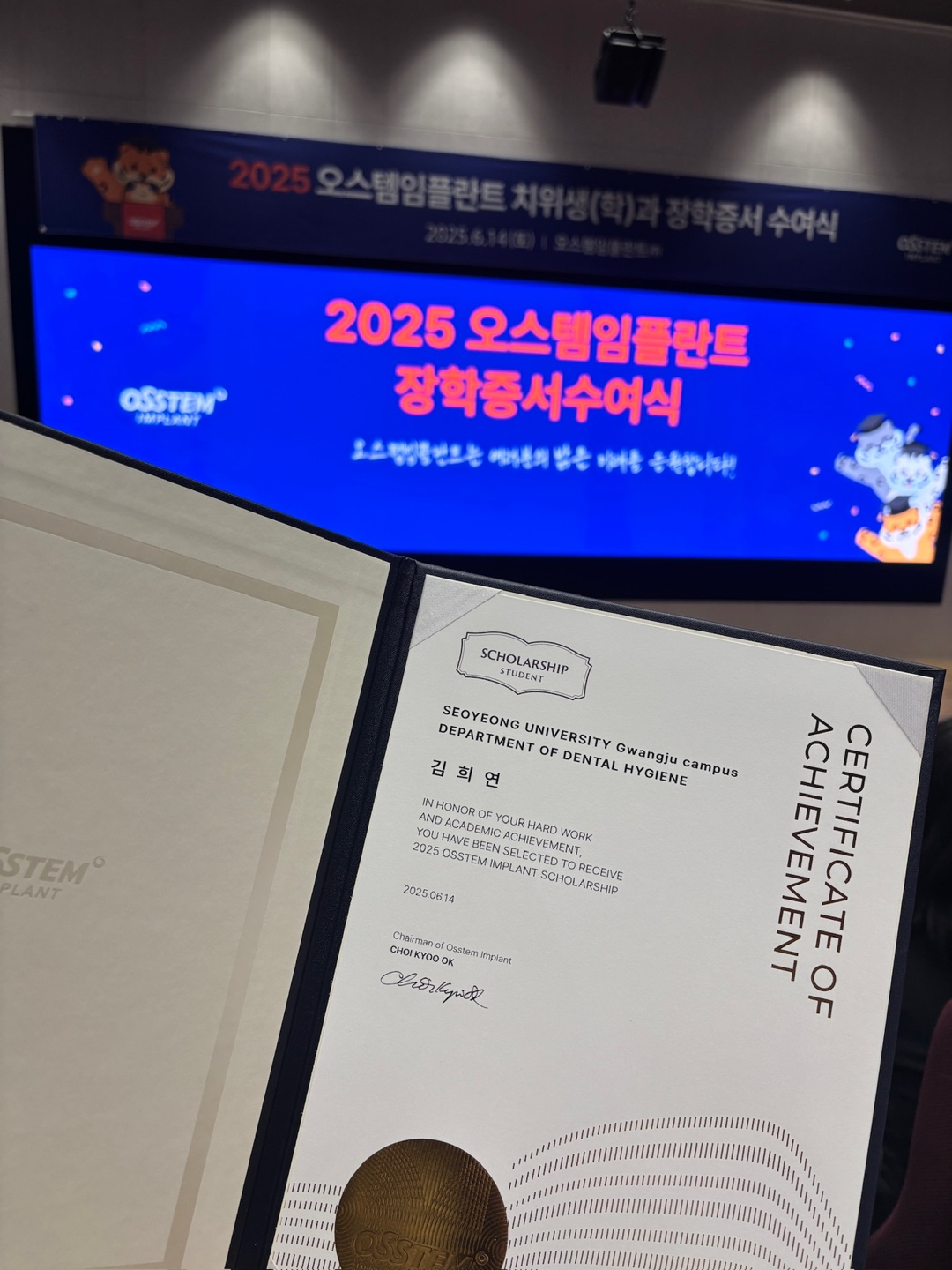 「2025 오스템임플란트 치위생학과 장학증서 수여식」이 성공적으로 개최되었습니다.