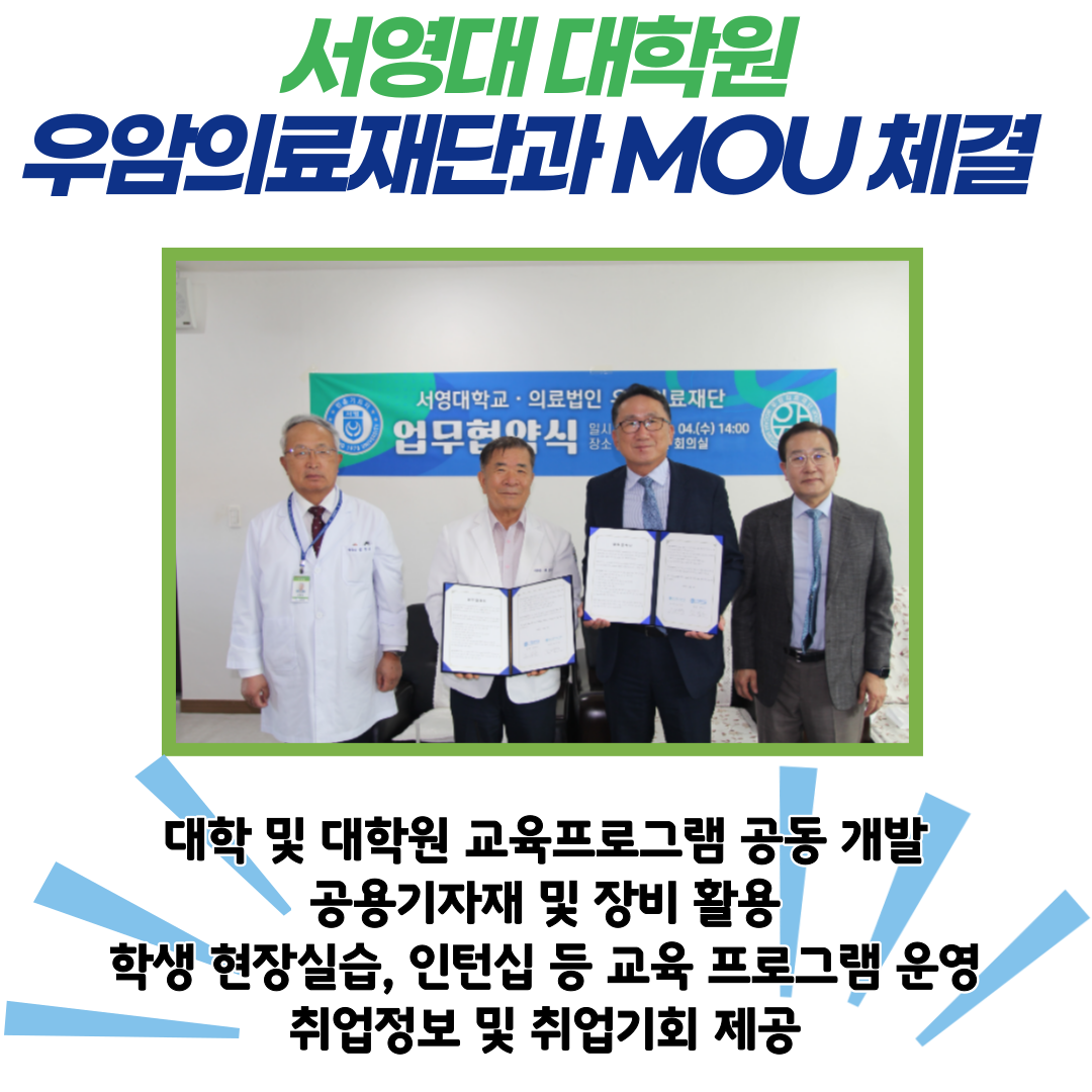 ○서영대학교(총장 김정수)는 지난4일 의료법인 우암의료재단(각화우암병원,첨단우암병원)과 산학협력 업무협약을 체결했다.