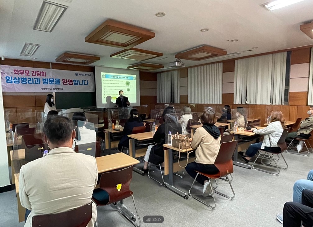 서영대학교 임상병리과에서는 2021학년도 학부모님을 초청하여 학과소개 및 향후 면허취득과 취업을 위한 학과의 노력에 대해 학부모님과 소통의 시간을 마련하였습니다. 늦은 시간에도 불구하고 학과장(조영국교수)을 비롯한 소속교수님들과 3학년 학부모님 20여분이 함께 학생들의 면허취득과 취업에 대한 다양한 정보와 4학년 전공심화 학사과정에 대한 높은 관심속에서 1시간이 넘는 열띤토론의 시간을 가졌습니다. 이자리에서 2021학년도 3학년 지도를 맡은 조영국교수님은 3학년 학생들의 면허취득을 위한 학습활동의 필요성과 이를 위한 지원노력 그리고 질높은 취업을 위해 가정과 학교의 공동노력을 제안하였으며, 광주전남에서 취업명문학과로서의 위상을 높이기 위해 최선을 다하겠다는 포부를 밝혔습니다. 참석하신 학부모님들은 지도교수님 발표이후 많은 질문을 통해 학생취업 및 면허취득관리의 노력을 확인하시고 뜨거운 박수 갈채를 보내주셨습니다. 간담회 참석하신 어머님께 참석소해를 묻는 질문에는 "대학과 학과교수님들의 노력에 큰 박수를 보내며 굉장히 유익하고 의미있는 시간이였으며, 대학에서 이러한 학부모들과 함께 우리애들을 위해 최선을 다해주고 계시는 것이 너무나도 마음든든하고 감사드리며 이러한 임상병리과 교수님 열정에 정말 감동받았다" 라는 말씀을 전하셨습니다. 다시한번 코로나 상황에서도 3학년 학생들의 면허취득과 학생관리를 위해 최선의 노력을 다하시는 교수님들을 격려를 위해 바쁘신 시간속에서도 참석해주신 임상병리과 3학년 학부모님들께 다시한번 깊은 감사의 말씀을 전합니다. - 서영대학교 임상병리과 화이팅!!!