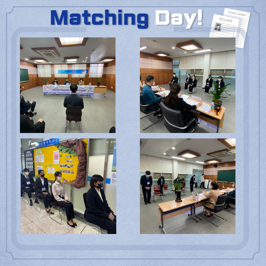 이번 매칭데이는 학생들 스스로가 작성한 이력서와 자기소개서를 바탕으로 산업체 면접위원들의 예리한 면접 질문에 응답함으로써 취업을 준비하는 임상병리과 졸업예정자들에게 다양한 면접 방식과 응대 요령을 체득하고 취업의 기회를 제공할 수 있는 좋은 시간이었다.