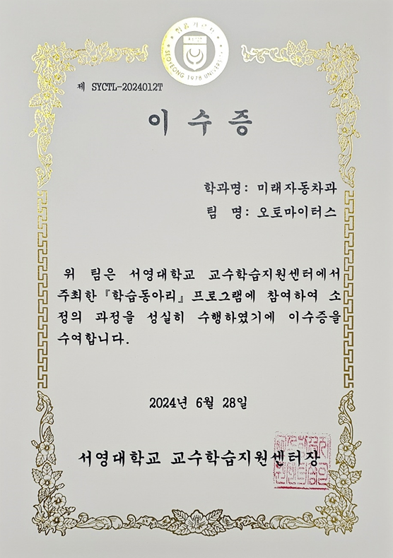 미래자동차과 정비 학습동아리인 오토마이스터가 서영대학교 교수학습지원센터에서 주최한 학습 동아리에 여하여 이수하고 "장려상"을 수상하였습니다.