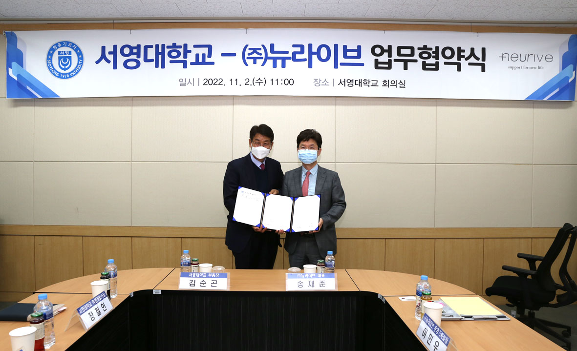 O. 우리대학(총장 김정수)는 2일(수) 서영대학교 회의실에서 고려구로병원 자회사인 ㈜뉴라이브(대표이사 송재준, 고대구로병원 이비인후과 교수)와 “서영대학교(파주) 임상병리학과와 함께 비침습적 미주신경자극(VNS) 기술을 활용한 전자약의 공동연구 및 보건계열 학생 취업”에 관한 업무협약을 체결했다.