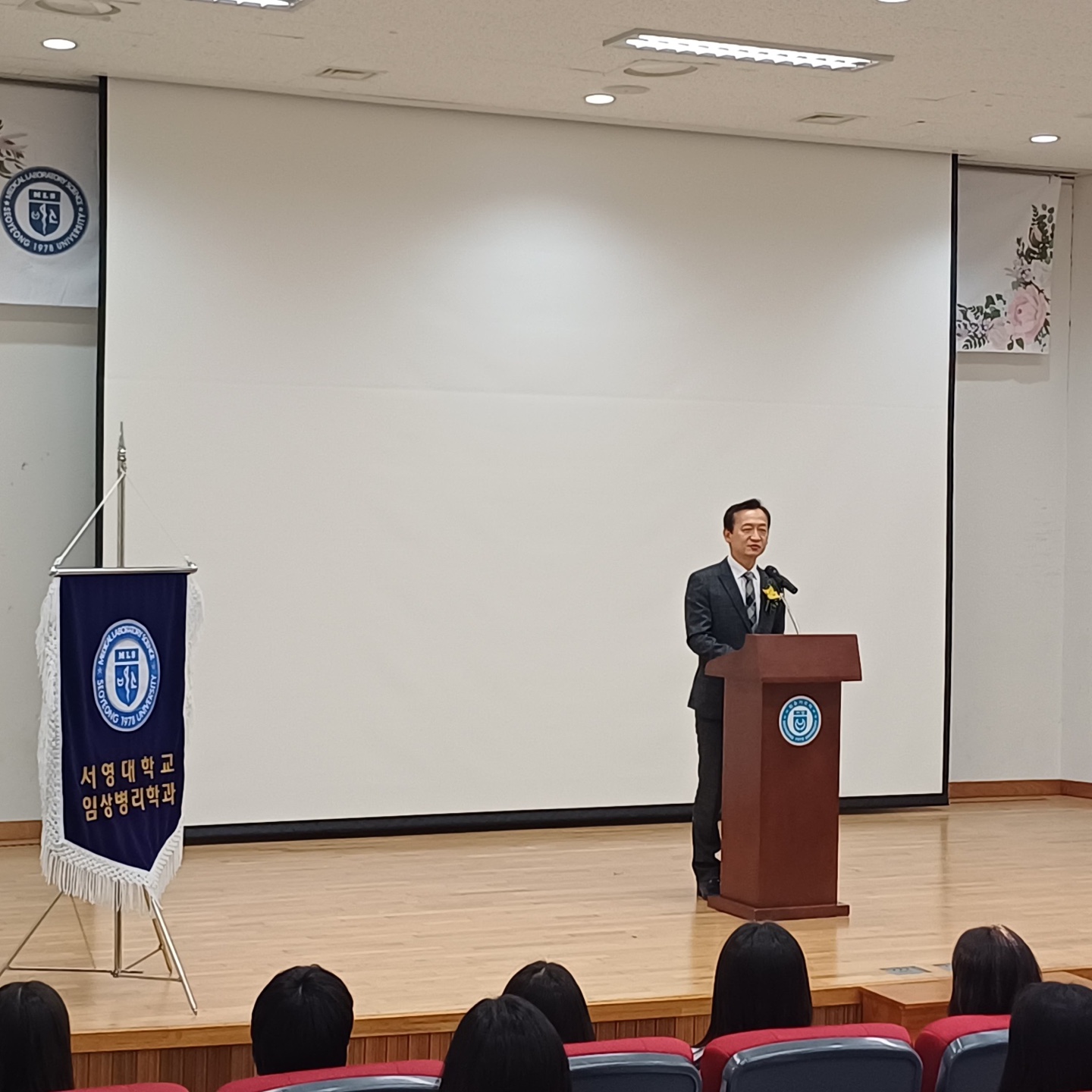 화이트 가운 수여식 이후에는 채희영 회장님께서 임상병리사의 진로와 다양한 진출 분야, 미래 비전에 대해 특강을 진행했다. 특히 채혈 실습의 중요성을 강조하며, “학교에서 기본기를 탄탄히 다져야 현장에서 경쟁력을 갖출 수 있다.”고 조언을 아끼지 않았다.