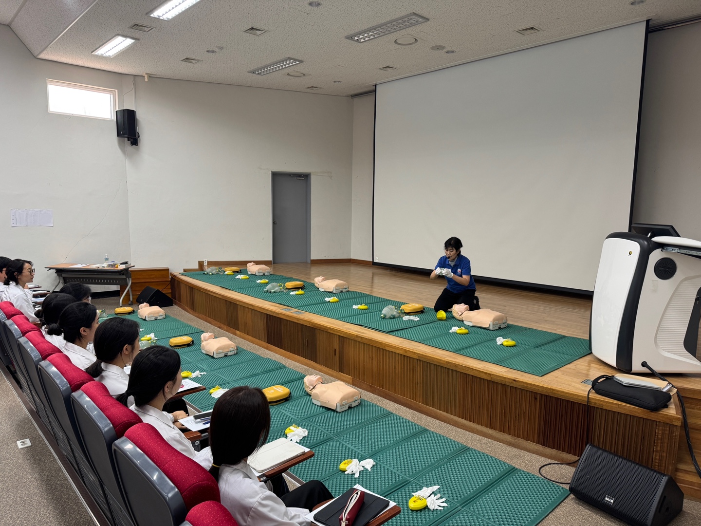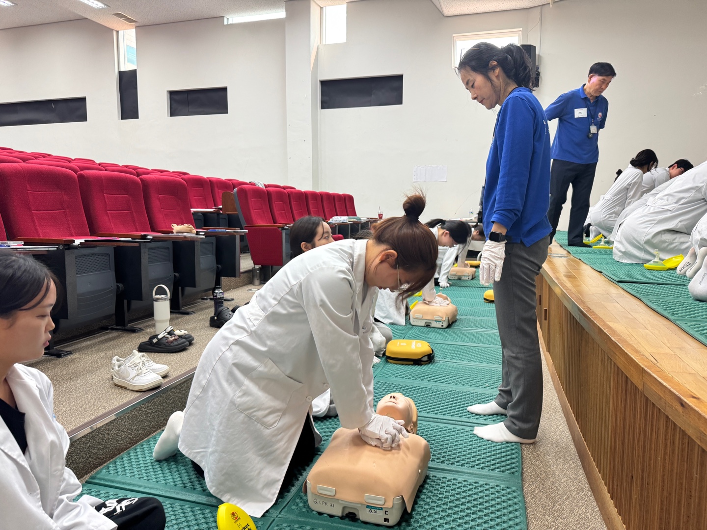 심정지 및 기도폐쇄 환자 발생 시 초기 대응 방안을 중심으로, 심폐소생술의 개념과 절차, 자동제세동기(AED) 작동법 등 이론 교육과 성인 및 영아 대상의 심폐소생술 술기 실습, AED 사용법 시뮬레이션, 기도폐쇄 대응 훈련 등의 실제 술기를 평가하는 실습 시험과 필기시험이 실시되었다.