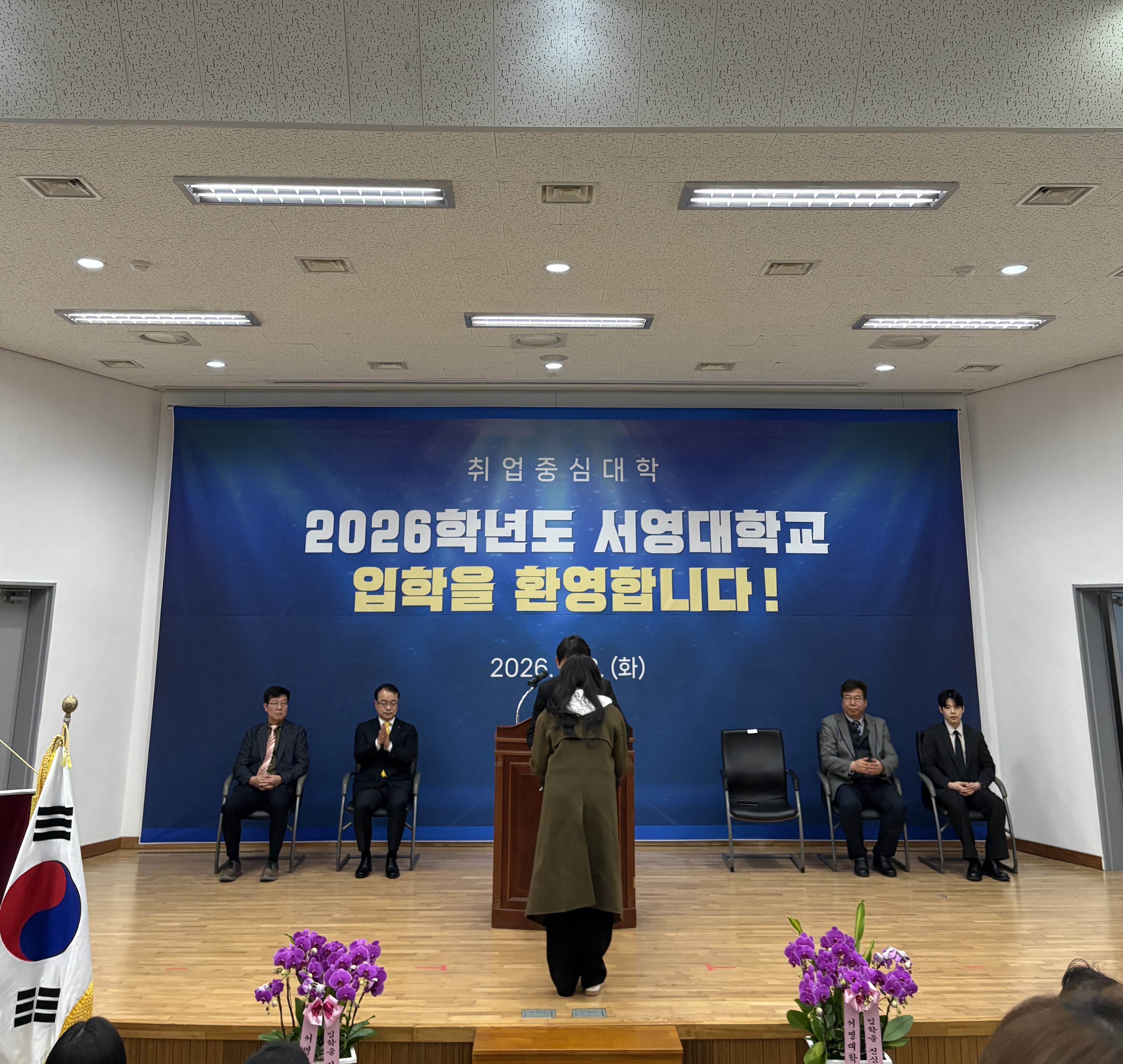 ○ 우리대학(총장 김정수)은 3월 3일(화) ‘2026학년도 서영대학교 입학식’을 개최하였다. 서영대학교 서강홀에서 진행된 이번 입학식에는 장철인 입학부총장, 김명재 취업처장, 김희재 기획부처장을 비롯한 학교 관계자와 교직원, 내빈, 신입생과 이를 축하하기 위한 가족 및 내빈이 참석하였다. 신입생들이 뜻깊은 순간을 함께할 수 있도록 주간반 신입생을 위한 주간 입학식과 야간반 신입생을 위한 야간 입학식으로 나누어 총 두 차례에 걸쳐 진행되었다.